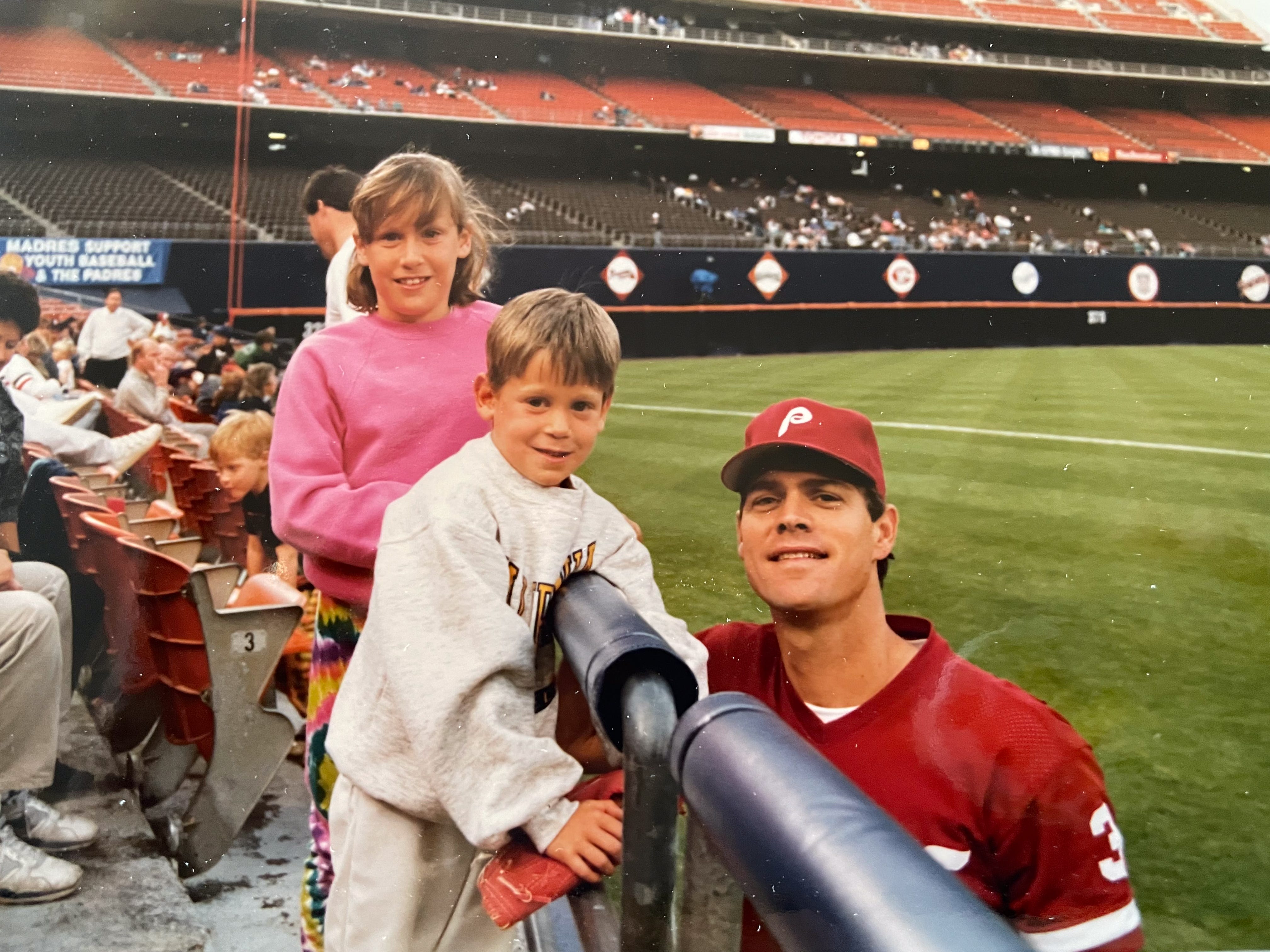 “We did a Phillies camp once and got to go do drills on the field. Veterans Stadium had Astroturf that was like pavement with turf on it. I remember at the time, Lenny Dykstra, other players would complain because he would chew tobacco and then spit it in the outfield. My mom and one of our neighbors had a flag-making company and got to make a flag for John Kruk.”