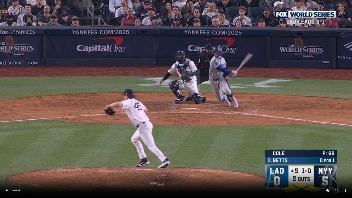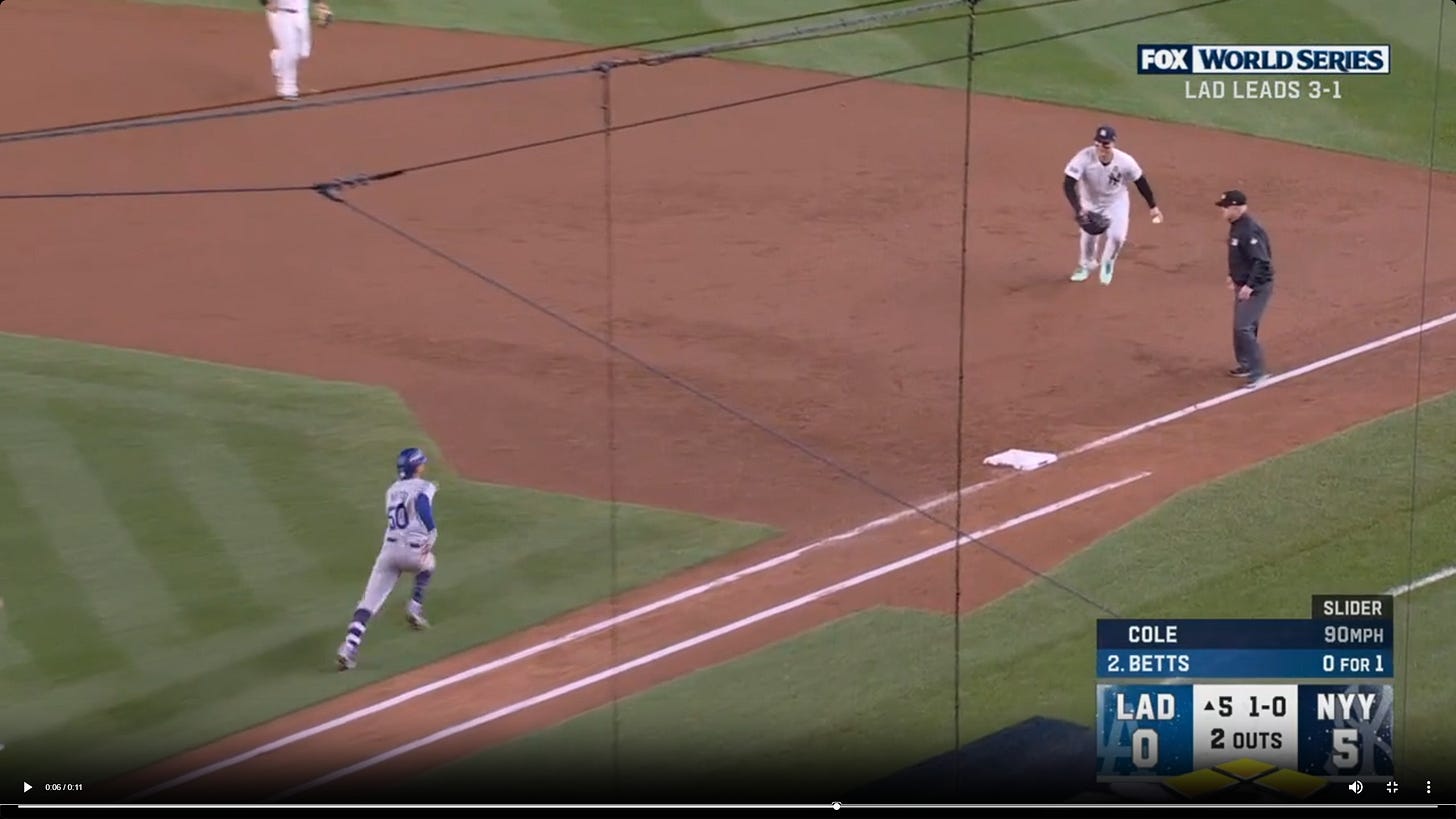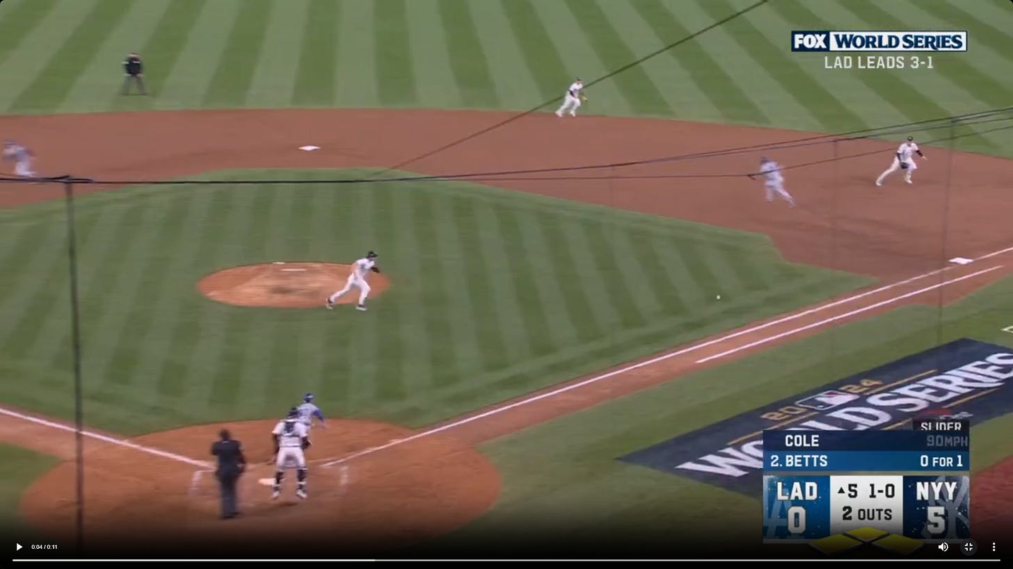The 5th inning of Game 5 of the World Series saw the Yankees go from a 5-0 lead with their ace on the mound, looking to cruise to a win and send the series back to LA down 3-2, to a catastrophe of errors that wound up with 5 unearned runs by the Dodgers to tie the game and ultimately win the game and the championship. Aaron Judge’s error was simple, he took his eye off the ball. Nothing to analyze there. Anthony Volpe’s throw to Jazz Chisholm was a bad throw, but still a bit of a higher difficulty play. Then there was Mookie Betts’ ‘single’ to first, a play that saw Anthony Rizzo field a ball deep behind the bag and Gerrit Cole failing to cover first: