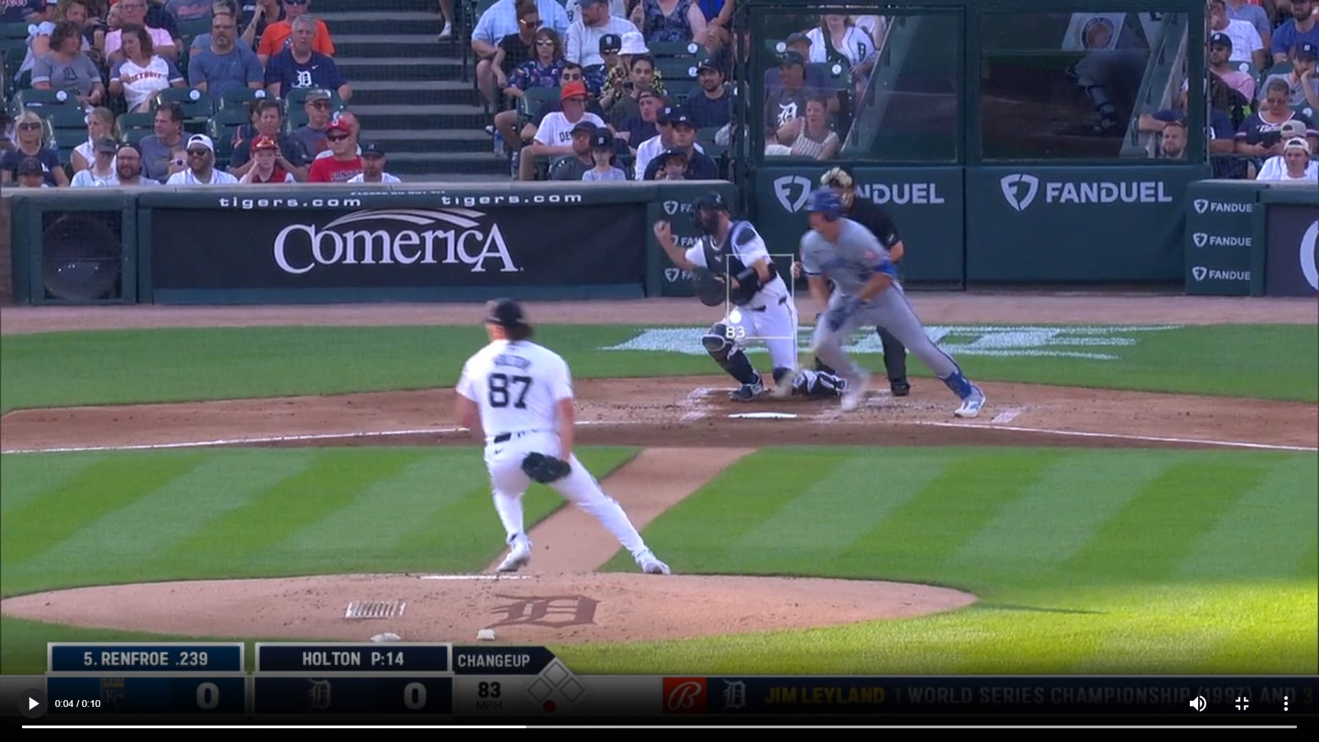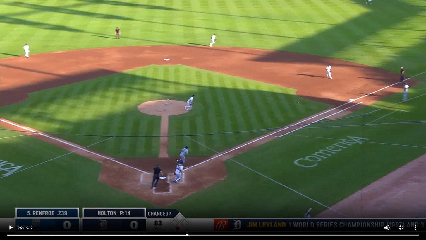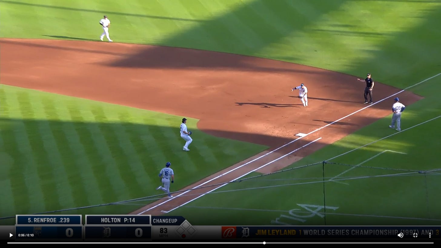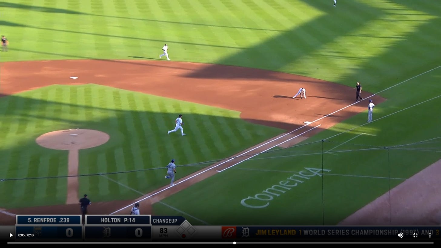 Here’s the most similar looking play I found. It’s a ground out by Kansas City Royals hitter Hunter Renfroe to Detroit Tigers first baseman Bligh Madris, with Tyler Holton pitching: