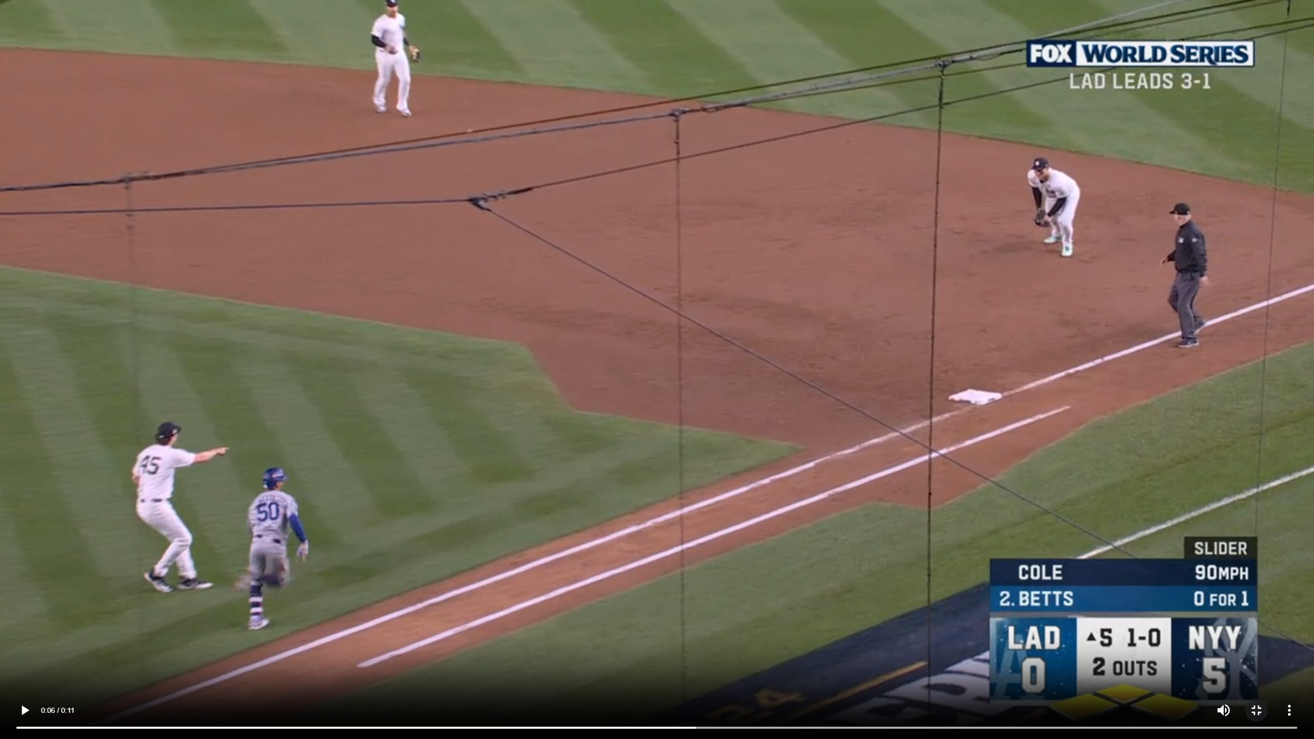 Whose fault was it? Gerrit Cole is taking most blame. It’s an in-between play where both fielders could have gotten confused about what the other was doing. Most of the time, the pitcher would book it to the bag and if the first baseman has it under control, waves him off. But Cole points to the bag as Betts whizzes by.